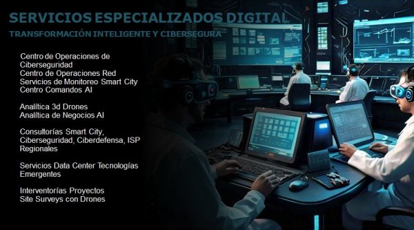Servicios Especializados de Consultorías para Ciudades Inteligentes Gestión Inteligente del Tráfico: Soluciones para monitorear y gestionar el tráfico en tiempo real, mejorando la movilidad urbana. Iluminación Inteligente: Implementación de sistemas de iluminación que se ajustan automáticamente para ahorrar energía y mejorar la seguridad. Gestión de Residuos: Soluciones para la gestión eficiente de residuos mediante sensores IoT y análisis de datos. Seguridad Ciudadana. Planeación y Diseño Red Privada Smart and Safe City. Site surveys punto control con Analítica de drones. Planeación, análisis y diagnóstico de recursos y tecnologías actuales para diseño de territorios digitales y ciberseguros. Diseño de Centro Comando Integral Ciudad Inteligente AI. Diseño de Centros Monitoreos C2,C4, C5 con integraciones y cumplimientos normativos. |